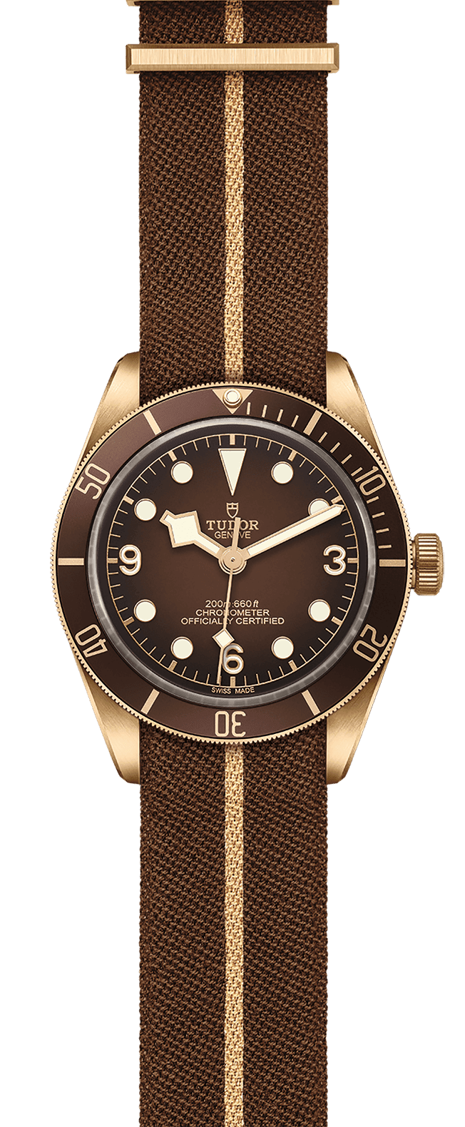 Eines genau dieser Armbänder einer historischen Taucheruhr, ein elastisches Band aus einem Rettungsfallschirm, dient bis heute in den TUDOR Archiven der historischen Dokumentation – und wurde zur Inspiration für das gewobene Jacquardband in Bronzebraun.