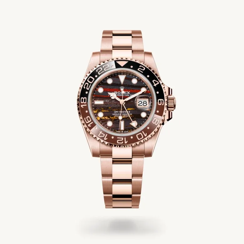 Diese GMT‑Master II besitzt ein Zifferblatt in Tigereisen. Dieses von Rolex bislang noch nie für diese Uhr verwendete metamorphe Gestein sticht durch seine reichhaltige Textur hervor. Der Stein, eine Mischung aus drei Mineralien – Tigerauge, roter Jaspis und silberner Hämatit –, wurde mit seinen goldenen und orangefarbenen Reflexen dank sorgfältiger Auswahl und Zusammenstellung harmonisch mit dem Farbton des Gehäuses und des Armbands in Einklang gebracht.