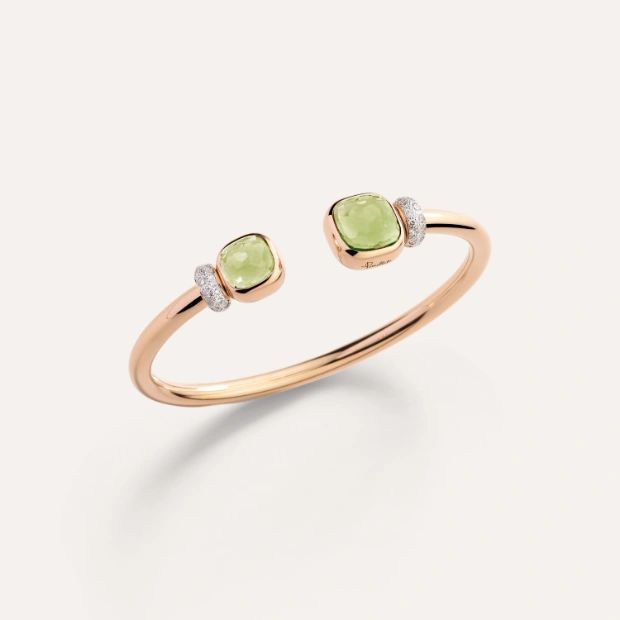 Die lebhaften Farben und die asymmetrischen Steingrößen sind Motive des Nudo-Designs, die in dieser sehr modernen Version des klassischen Armreifs zu neuem Leben erwachen. Ein starrer, offener Armreif, der das Handgelenk umschließt und zwei leuchtende Prasiolith-Edelsteine zur Schau stellt, passt immer und ist leicht zu kombinieren.