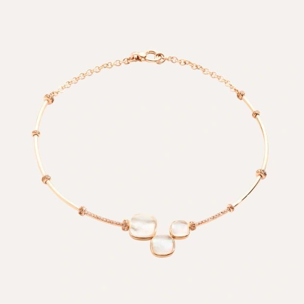 Eine edle Halskette vereint die Kühnheit von Nudo mit der Farbintensität und dem Volumen des Clessidra-Schliffs. Drei weiße Topase mit zweiseitigem Schliff mit Perlmutt sind auf einer halbstarren, kurzen Halskette mit Diamanten gefasst.
