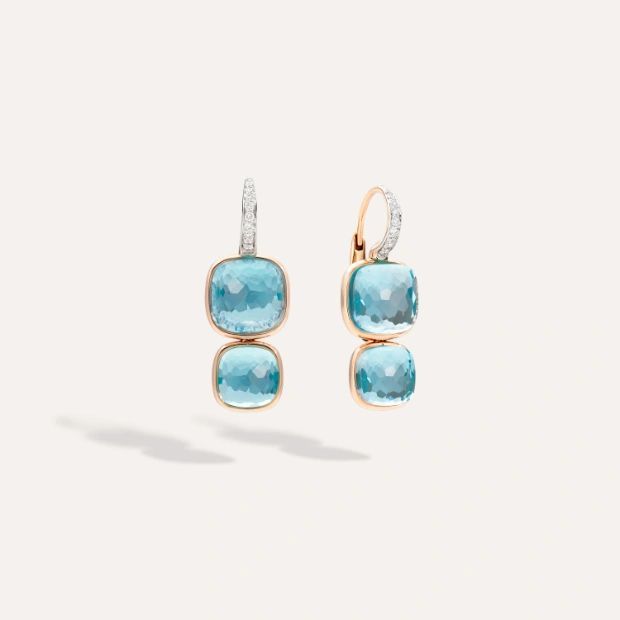 Nudo präsentiert zum ersten Mal einen glamourösen Ohrring mit zwei Tropfen aus himmelblauem Topas.Die beiden Edelsteine sind nahtlos aneinander gefügt und in der Mitte von einem Goldband umschlossen, das dank des einzigartigen Clessidra-Schliffs der Maison das Lichtspiel verdoppelt und neue Farberlebnisse ermöglicht.