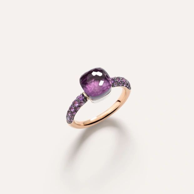 Nudo sind Schmuckstücke im unverwechselbaren Pomellato-Stil, die sich durch ihre leuchtenden Farben auszeichnen. Der neue Nudo Ring fällt durch seine ganz neue Kombination aus Amethyst und Jade mit einem Amethyst-Pavé auf.
