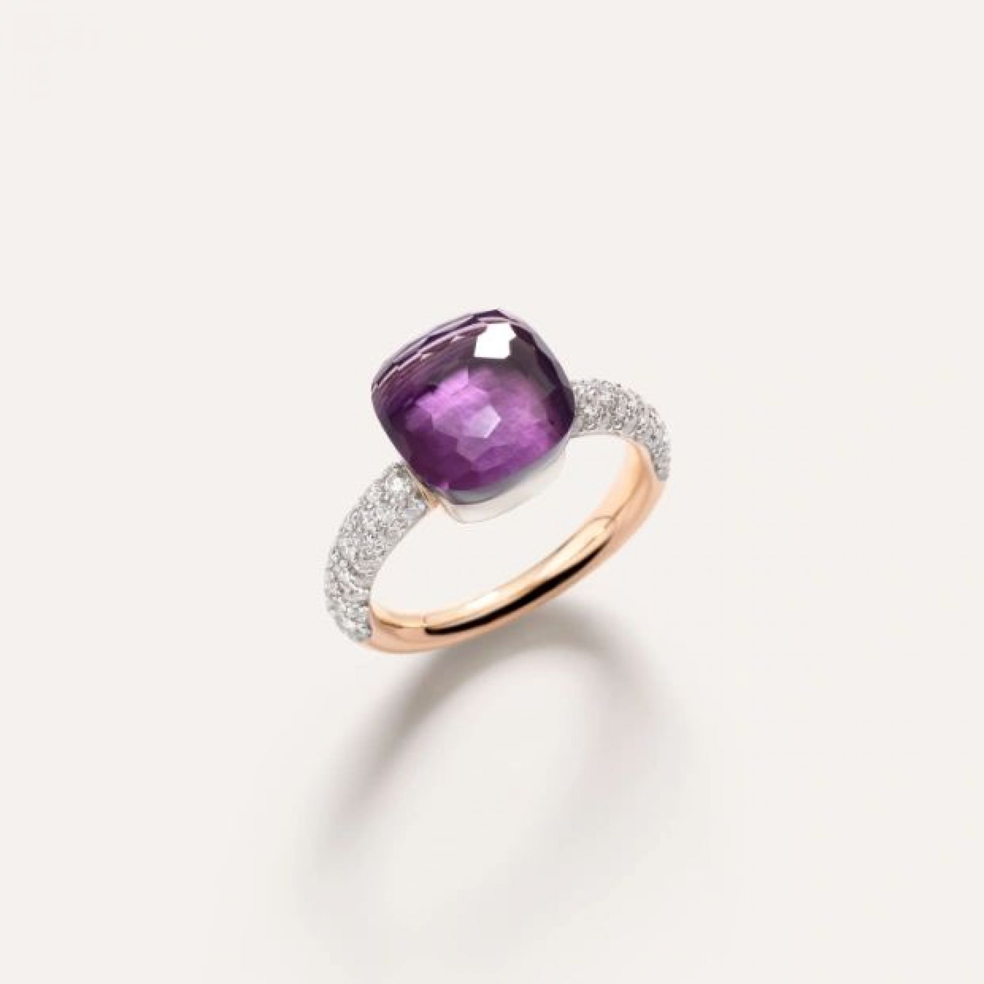Ring aus 18 Kt Rosé- und Weißgold mit 1 Amethyst (≈6.5 ct) und 58 weißen Diamanten (≈0.7 ct) auf weiß rhodiniertem 18 Kt Roségold.