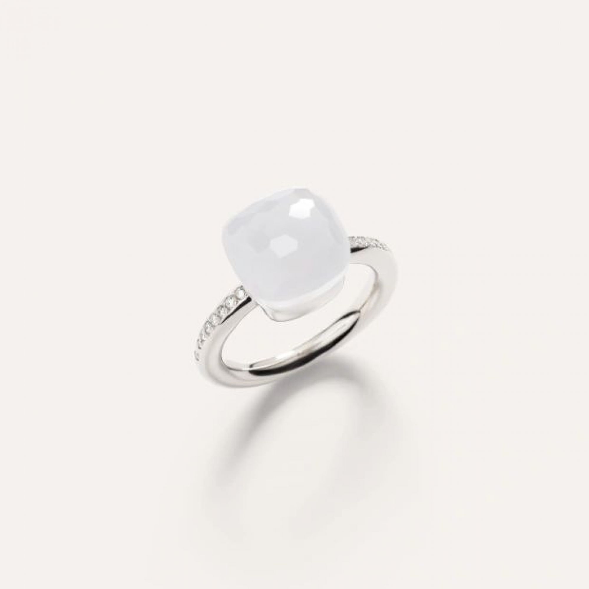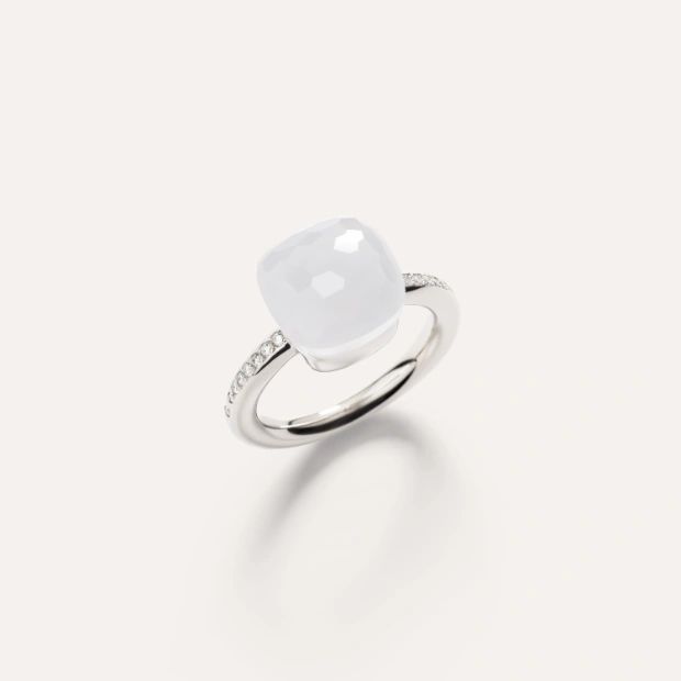 Immer auf der Suche nach Möglichkeiten, die innere Schönheit von Edelsteinen zur Geltung zu bringen, präsentiert die Nudo Milky Kollektion jetzt einen durchscheinenden cremefarbenen weißen Quarz. Ein klassischer Ring, der in Weißgold gefasst und mit Diamanten verziert ist. Zum ersten Mal verwendet Pomellato Mangan-Weißgold, eine neue Legierung, die ein länger schön bleibendes, helleres Weißgold ergibt.