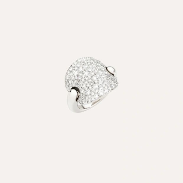 Der geschwungene Sabbia-Ring ist jetzt in Weißgold erhältlich, das dieser beliebten Kollektion einen raffinierten, kühlen Goldton verleiht. Der Ring ist mit einem taktilen Diamantenpavé in einem natürlichen Muster besetzt, das Sabbia seinen organischen und lässigen Chic verleiht.