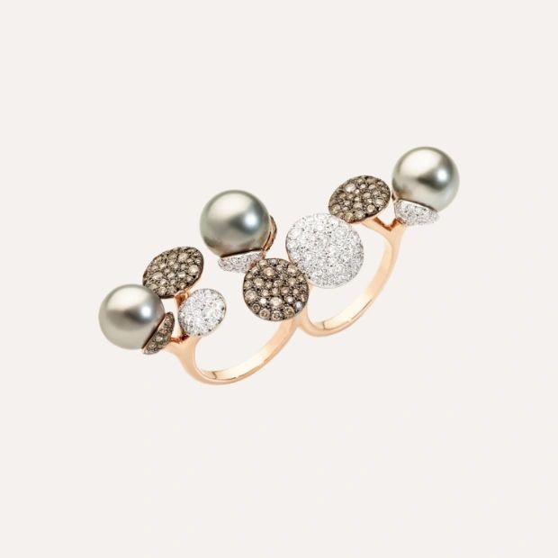 Ring aus 18 Kt Roségold mit 3 Tahiti-Perlen (≈24 ct), 125 weißen Diamanten (≈1.8 ct) auf weiß rhodiniertem 18 Kt Roségold und 156 braunen Diamanten (≈2.1 ct) auf schwarz rhodiniertem 18 Kt Roségold.
