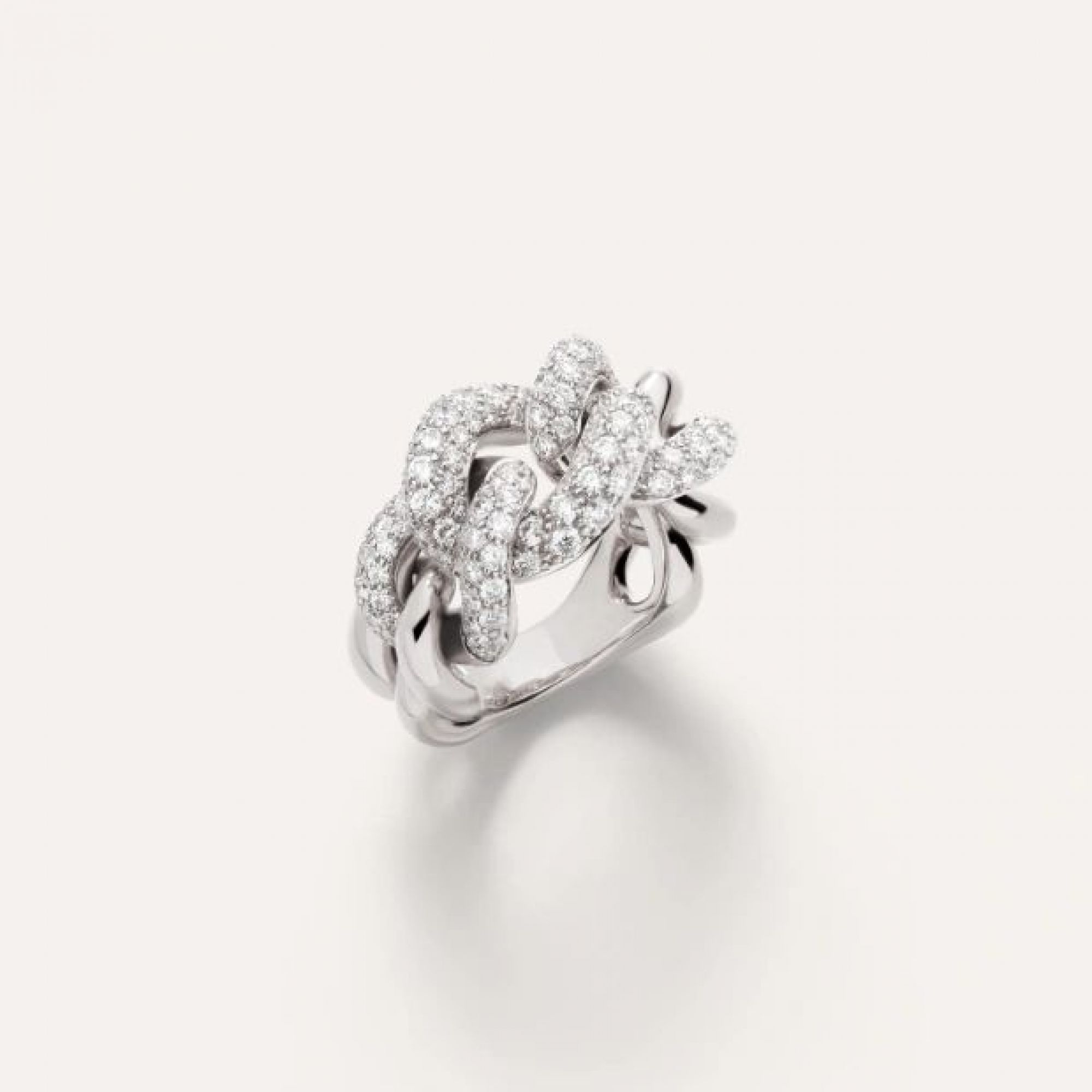 Catene ist eines der charakteristischen Designs von Pomellato, das direkt auf das reiche Erbe des Hauses in der Fertigung von Halsketten zurückgeht. Im Laufe der Jahre hat sich Catene wegen seiner mühelosen Eleganz als eine der beliebtesten Kollektionen von Pomellato etabliert. Die Ringe basieren auf den bekannt üppigen Gourmette-Gliedern, die zu üppigen, seidig glatten Ringen umgestaltet wurden. Die gegliederten Glieder sind mit einem massiven Steg verbunden, sodass sich die Glieder sanft am Finger bewegen können.