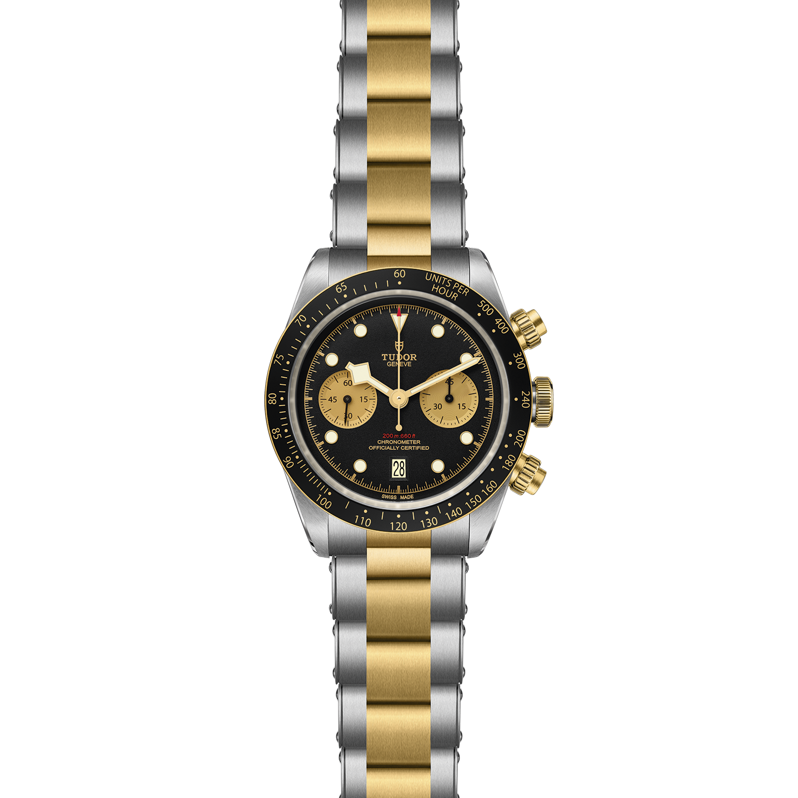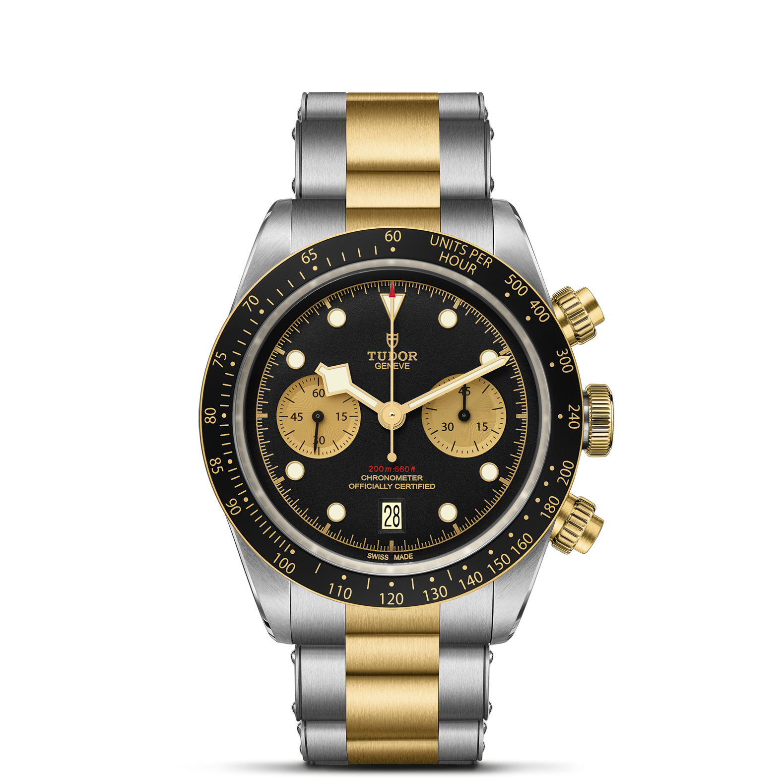 Verschraubbare Aufzugskrone mit TUDOR Rose im Relief. Verschraubbare Drücker in massivem Gelbgold auf der 2- und 4-Uhr-Position. Edelstahl, überzogen mit 0,3 mm Gelbgold