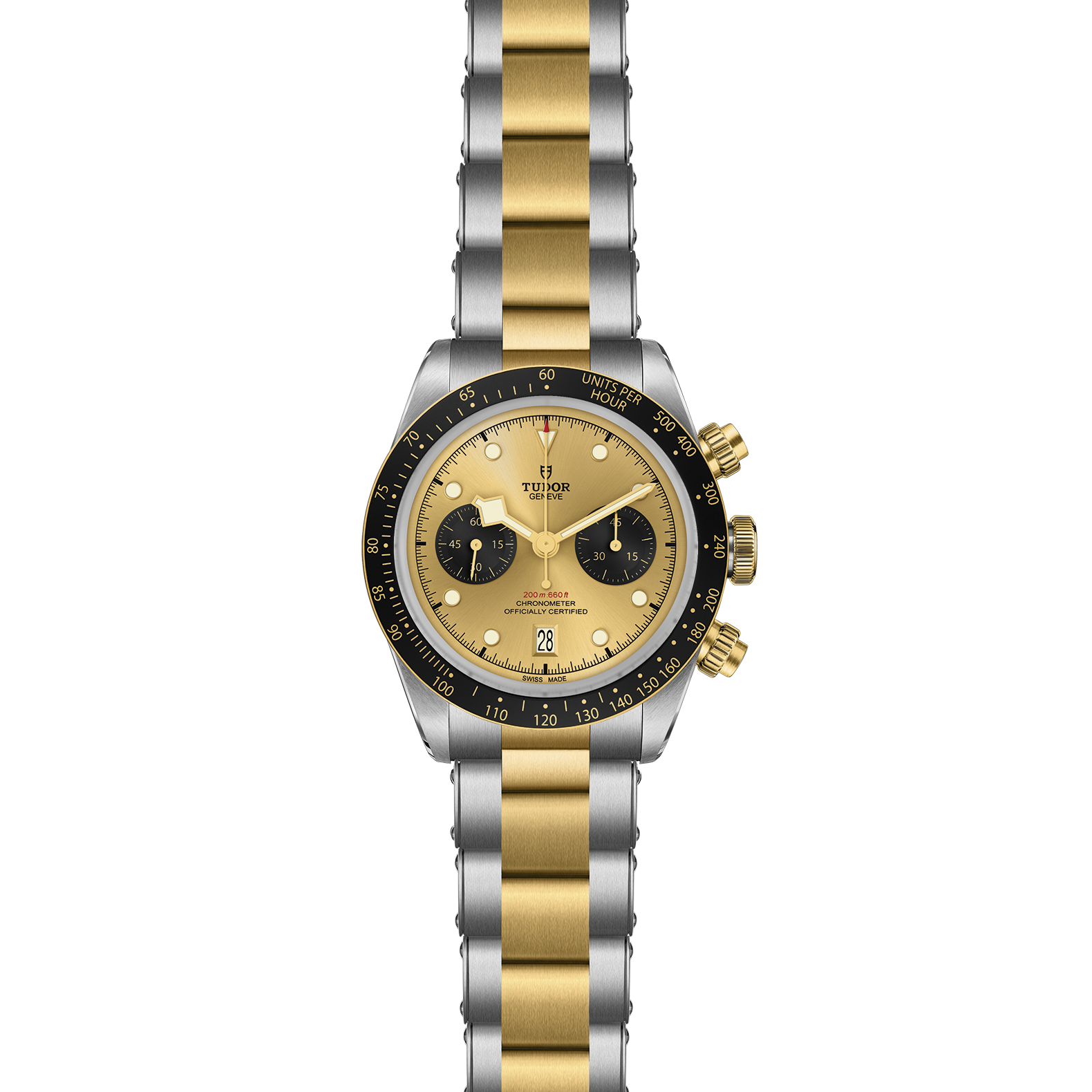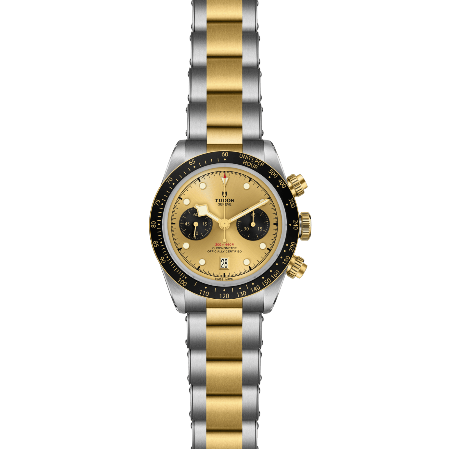 Verschraubbare Aufzugskrone mit TUDOR Rose im Relief. Verschraubbare Drücker in massivem Gelbgold auf der 2- und 4-Uhr-Position. Edelstahl, überzogen mit 0,3 mm Gelbgold