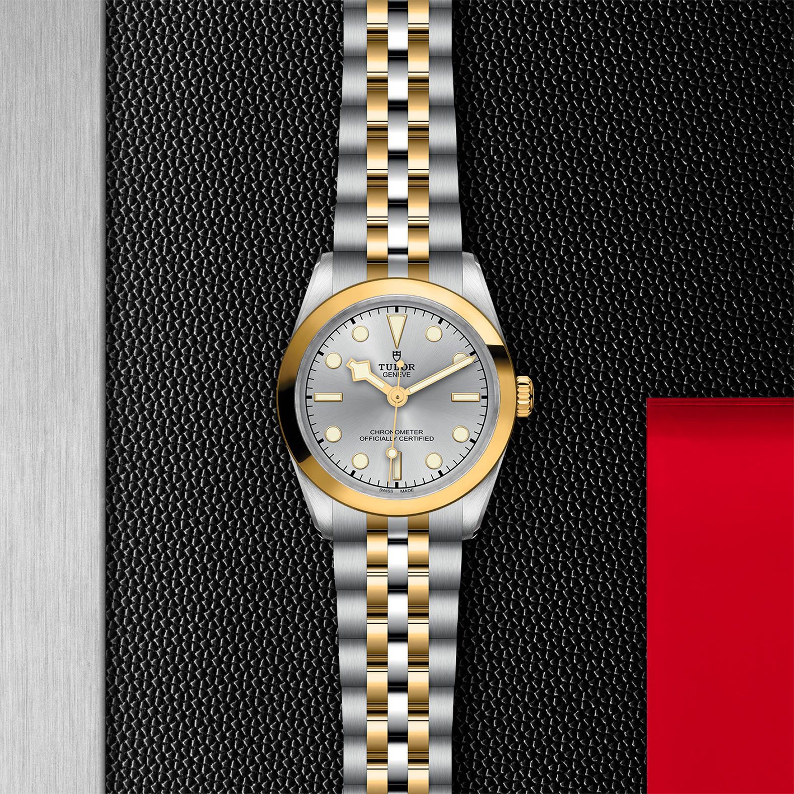 Erste Mittelelemente in Edelstahl oder massivem Gelbgold. Weitere Mittelelemente gefertigt in Edelstahl, überzogen mit 0,2 mm Gelbgold. TUDOR „T-fit“-Sicherheitsfaltschließe. Das Logo auf der Schließe ist aus massivem Gelbgold gefertigt.