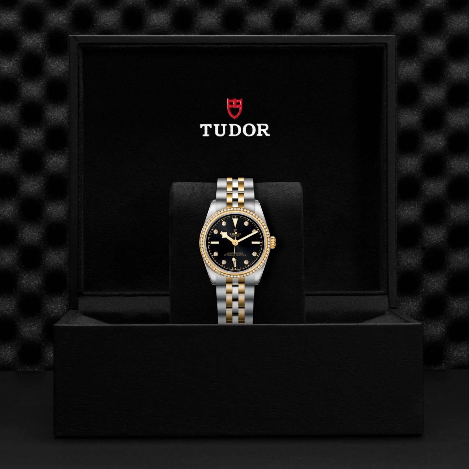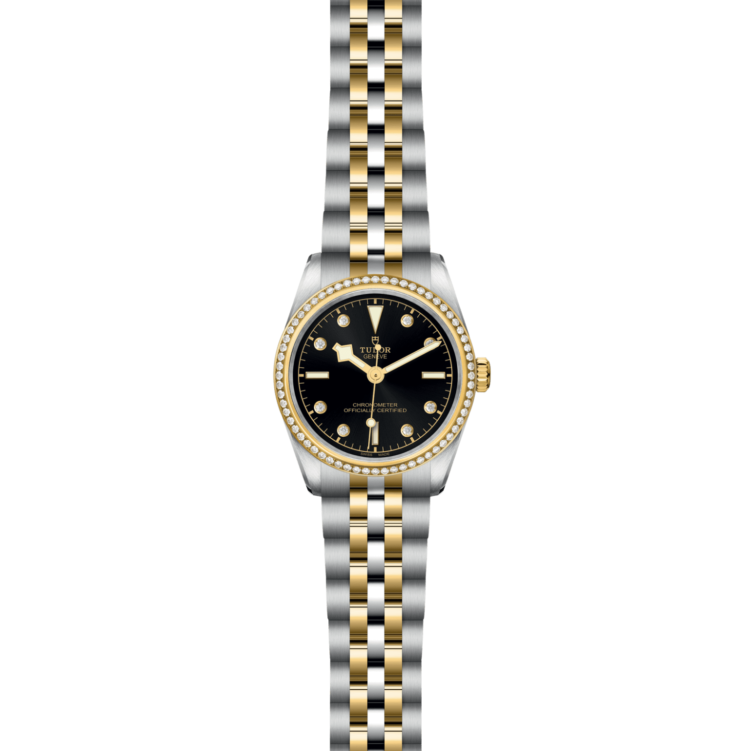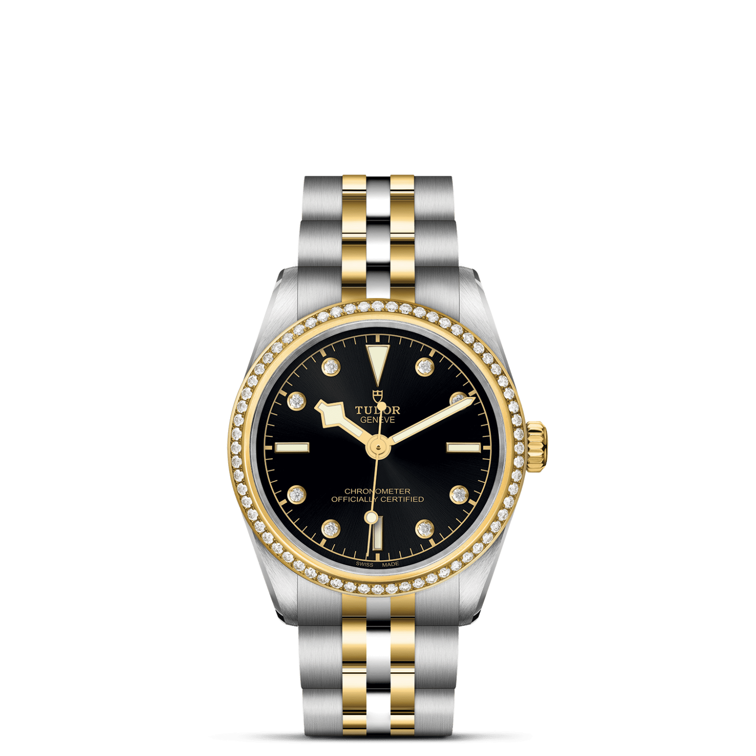 Erste Mittelelemente in Edelstahl oder massivem Gelbgold. Weitere Mittelelemente gefertigt in Edelstahl, überzogen mit 0,2 mm Gelbgold. TUDOR „T-fit“-Sicherheitsfaltschließe. Das Logo auf der Schließe ist aus massivem Gelbgold gefertigt.
