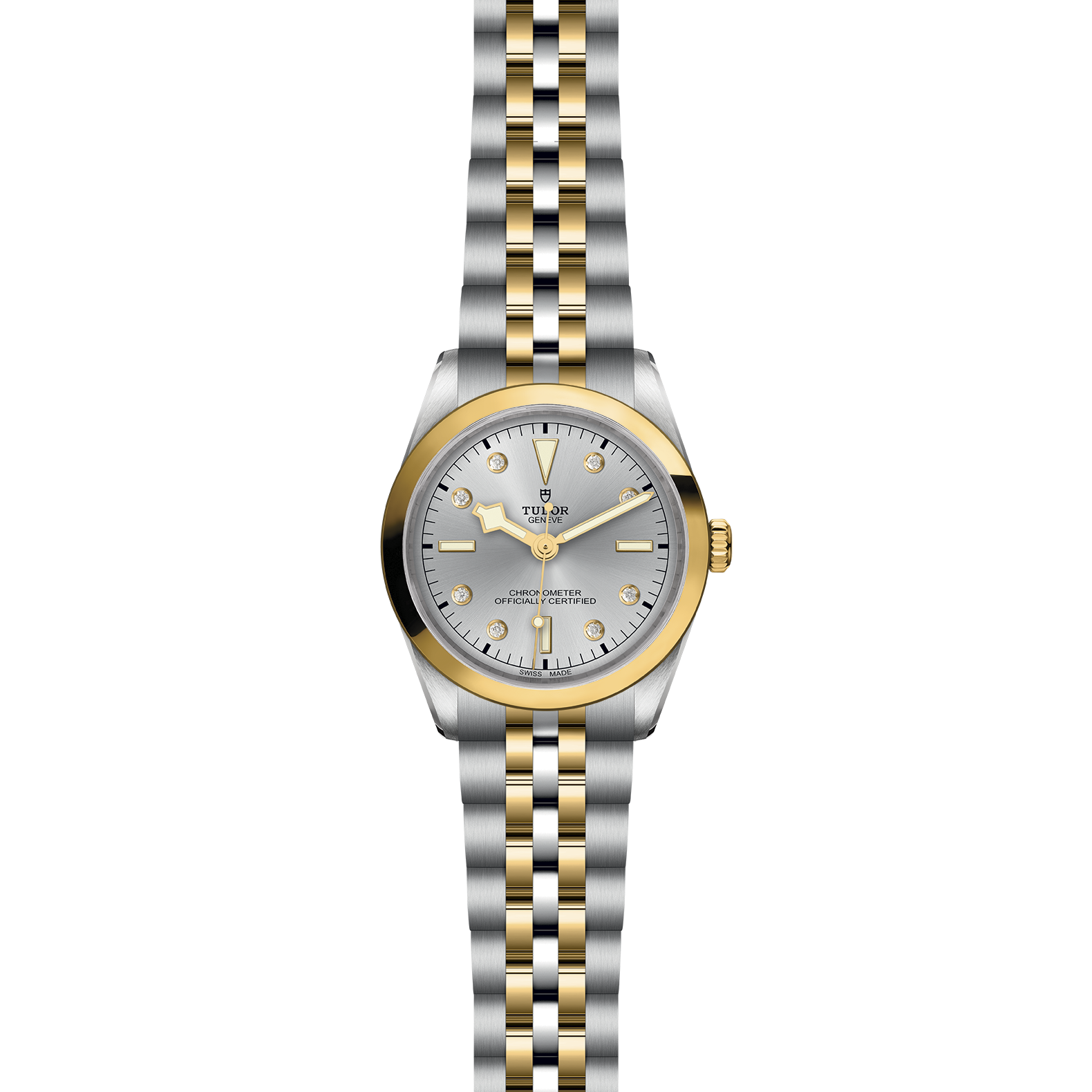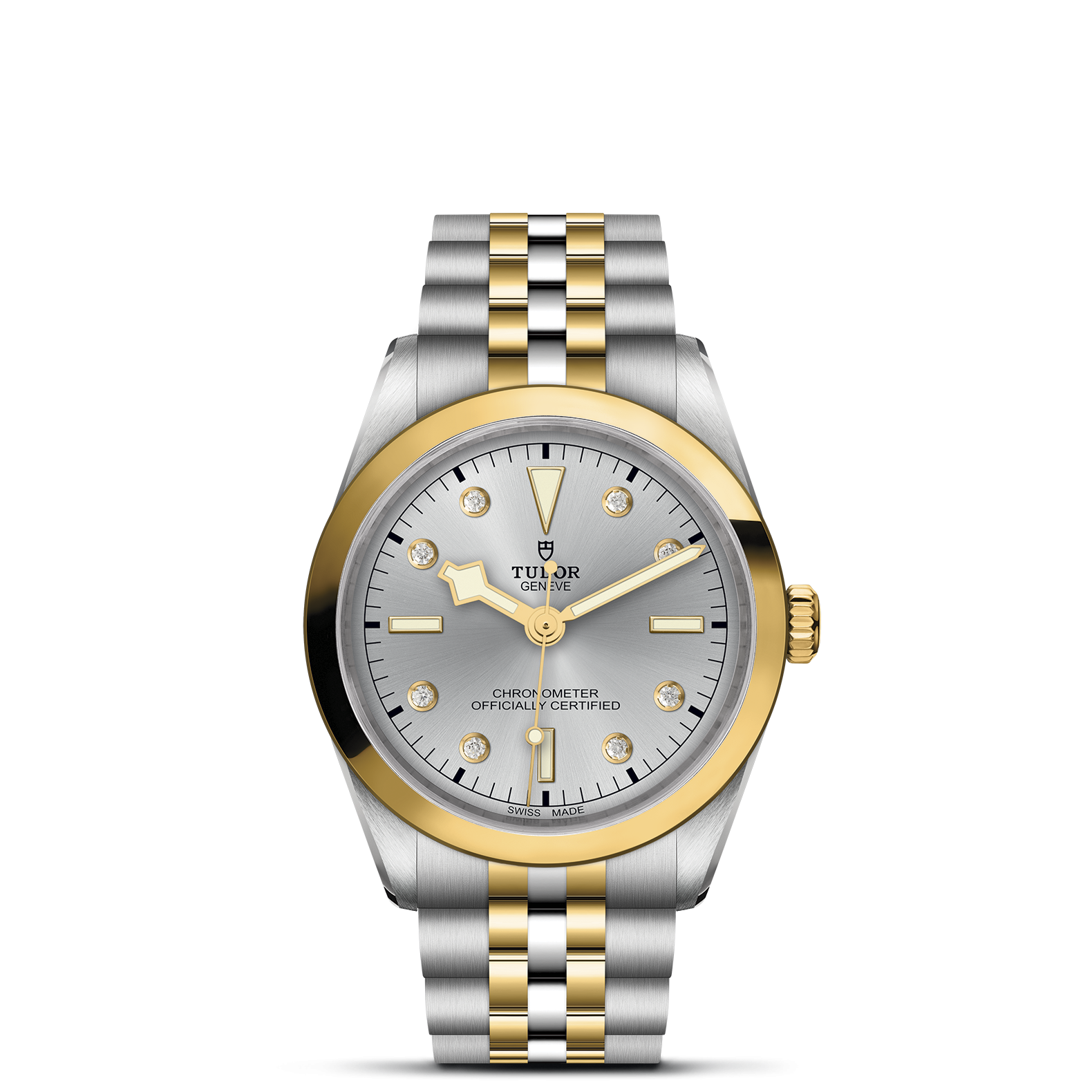 Erste Mittelelemente in Edelstahl oder massivem Gelbgold. Weitere Mittelelemente gefertigt in Edelstahl, überzogen mit 0,2 mm Gelbgold. TUDOR „T-fit“-Sicherheitsfaltschließe. Das Logo auf der Schließe ist aus massivem Gelbgold gefertigt.