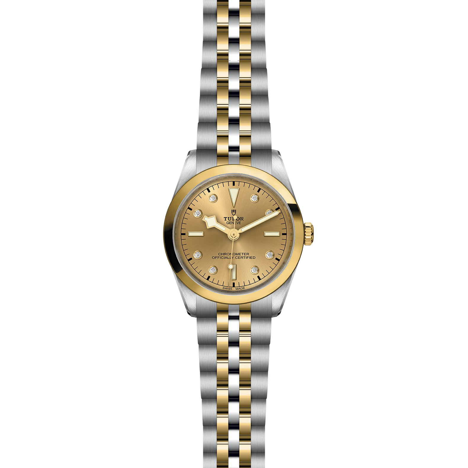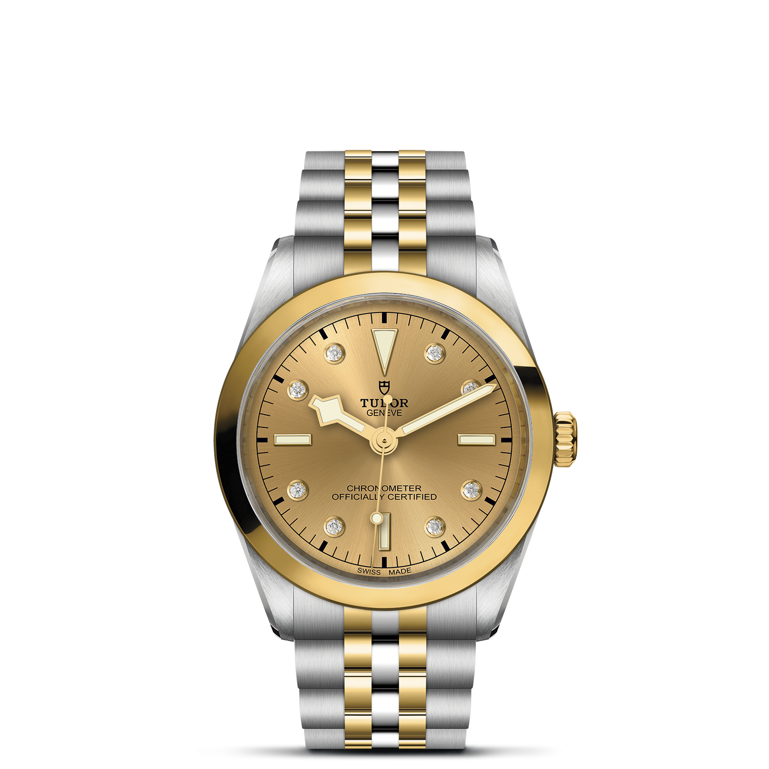 Erste Mittelelemente in Edelstahl oder massivem Gelbgold. Weitere Mittelelemente gefertigt in Edelstahl, überzogen mit 0,2 mm Gelbgold. TUDOR „T-fit“-Sicherheitsfaltschließe. Das Logo auf der Schließe ist aus massivem Gelbgold gefertigt.