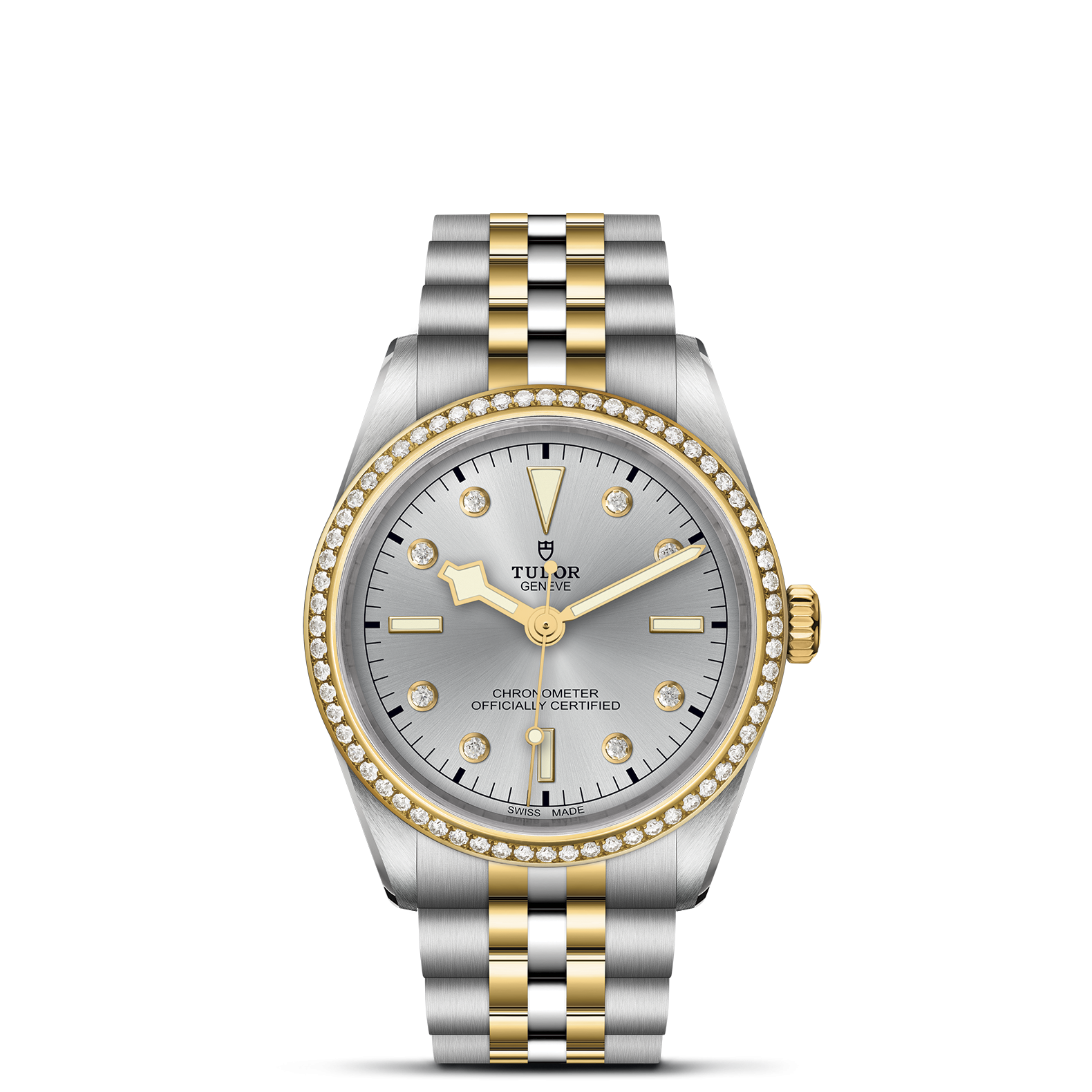 Erste Mittelelemente in Edelstahl oder massivem Gelbgold. Weitere Mittelelemente gefertigt in Edelstahl, überzogen mit 0,2 mm Gelbgold. TUDOR „T-fit“-Sicherheitsfaltschließe. Das Logo auf der Schließe ist aus massivem Gelbgold gefertigt.