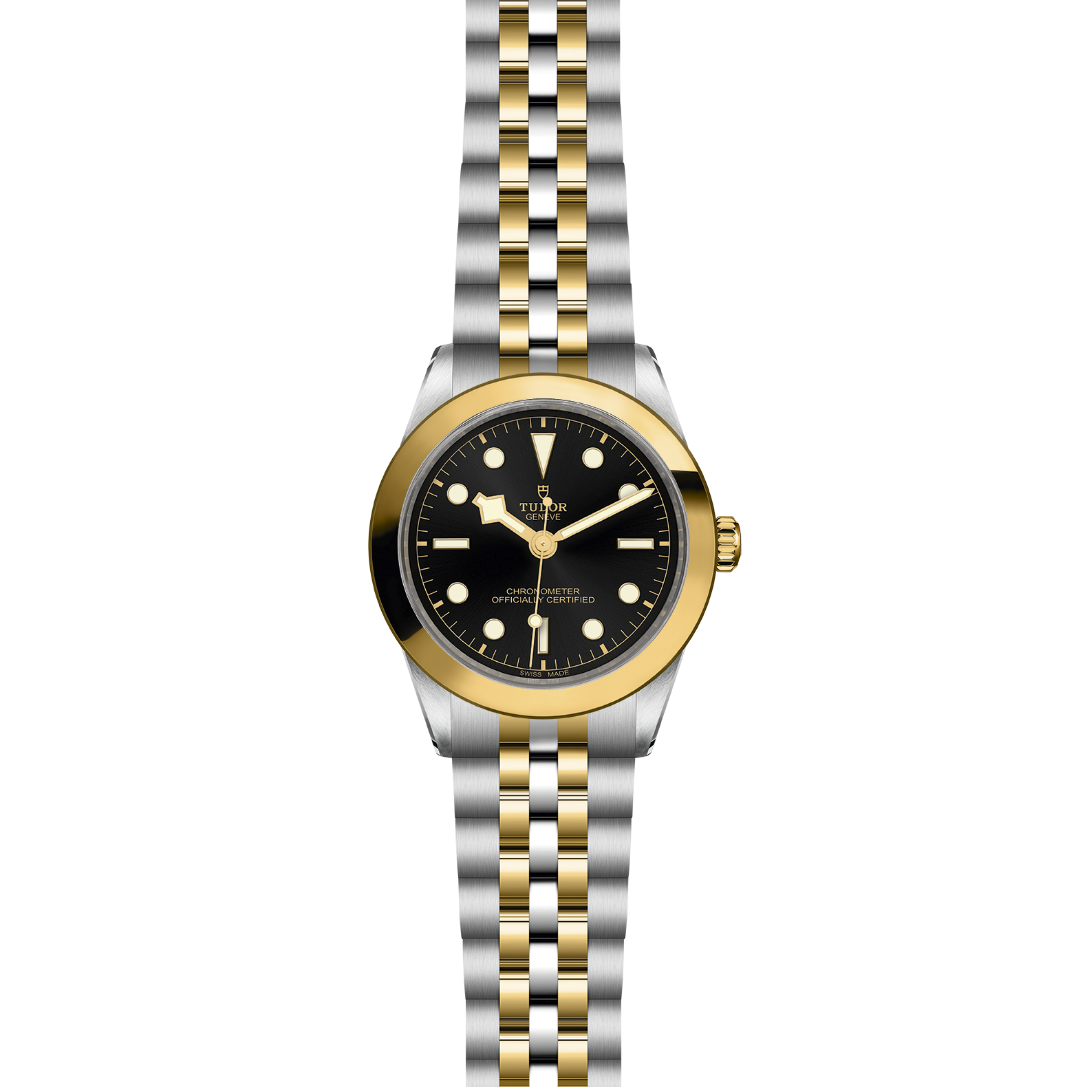 Erste Mittelelemente in Edelstahl oder massivem Gelbgold. Weitere Mittelelemente gefertigt in Edelstahl, überzogen mit 0,2 mm Gelbgold. TUDOR „T-fit“-Sicherheitsfaltschließe. Das Logo auf der Schließe ist aus massivem Gelbgold gefertigt.
