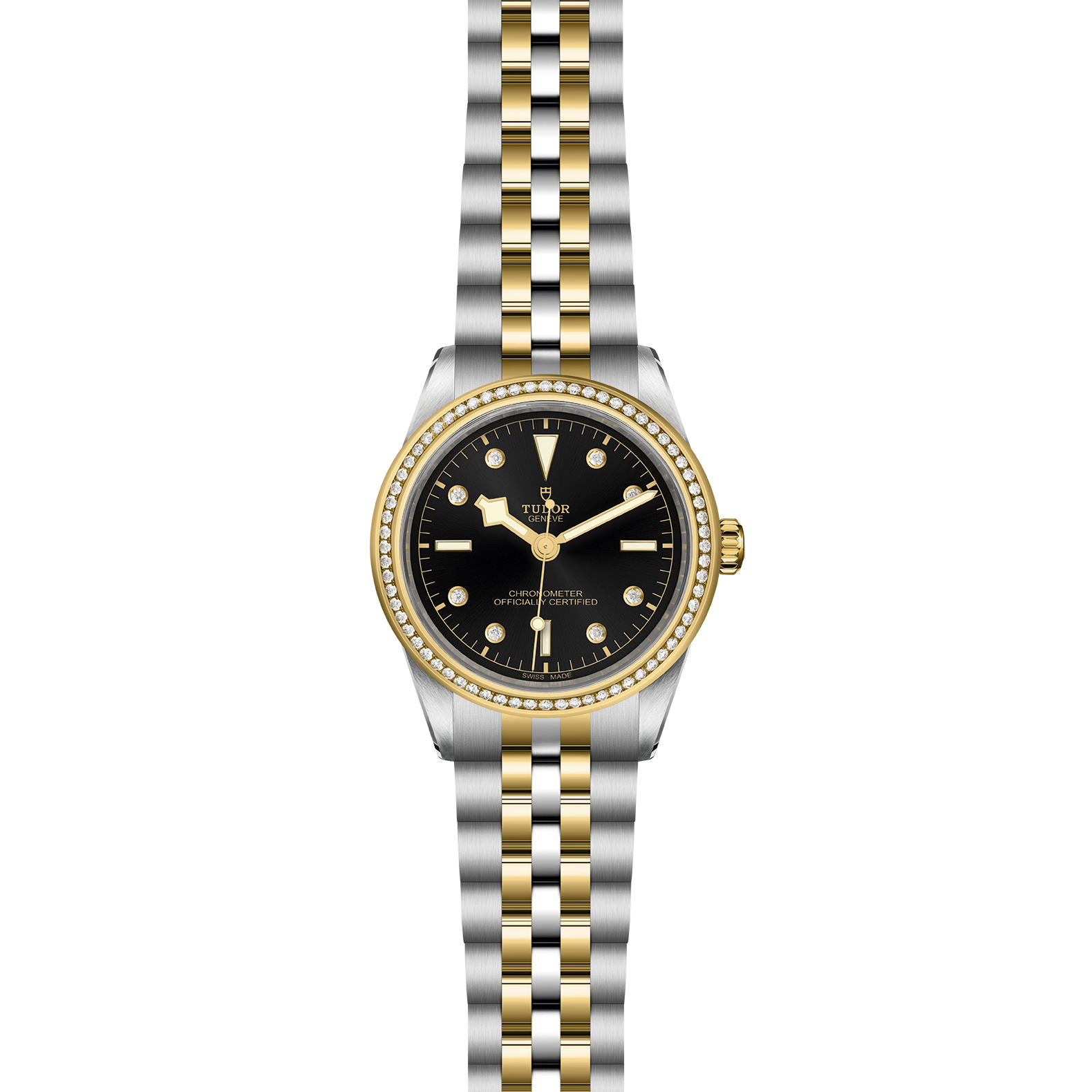 Erste Mittelelemente in Edelstahl oder massivem Gelbgold. Weitere Mittelelemente gefertigt in Edelstahl, überzogen mit 0,2 mm Gelbgold. TUDOR „T-fit“-Sicherheitsfaltschließe. Das Logo auf der Schließe ist aus massivem Gelbgold gefertigt.