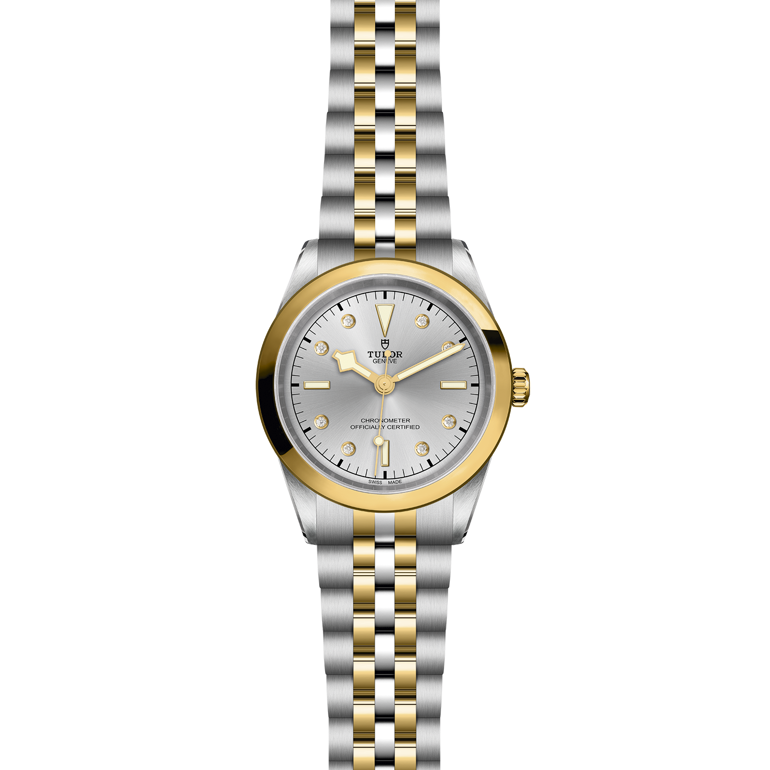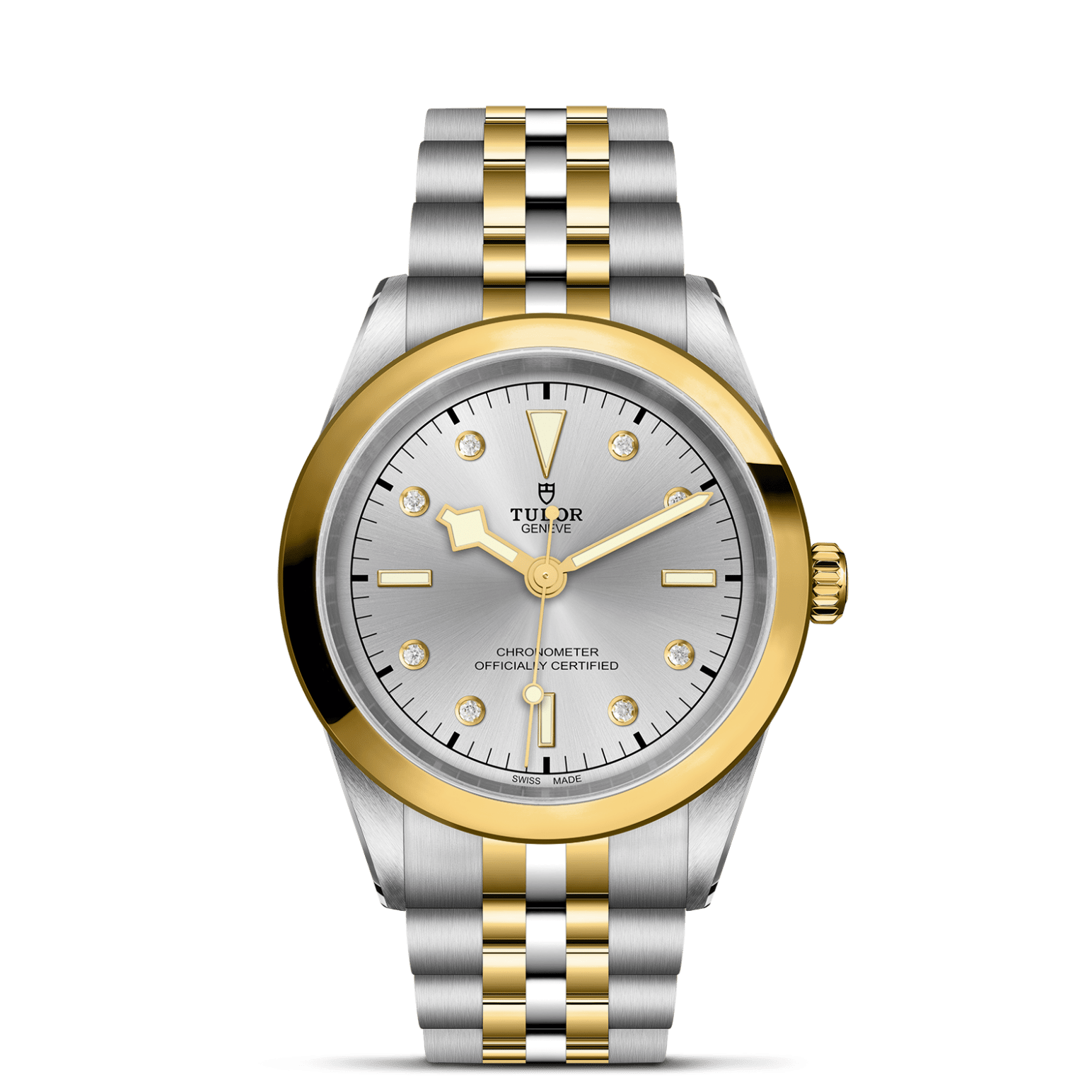 Erste Mittelelemente in Edelstahl oder massivem Gelbgold. Weitere Mittelelemente gefertigt in Edelstahl, überzogen mit 0,2 mm Gelbgold. TUDOR „T-fit“-Sicherheitsfaltschließe. Das Logo auf der Schließe ist aus massivem Gelbgold gefertigt.