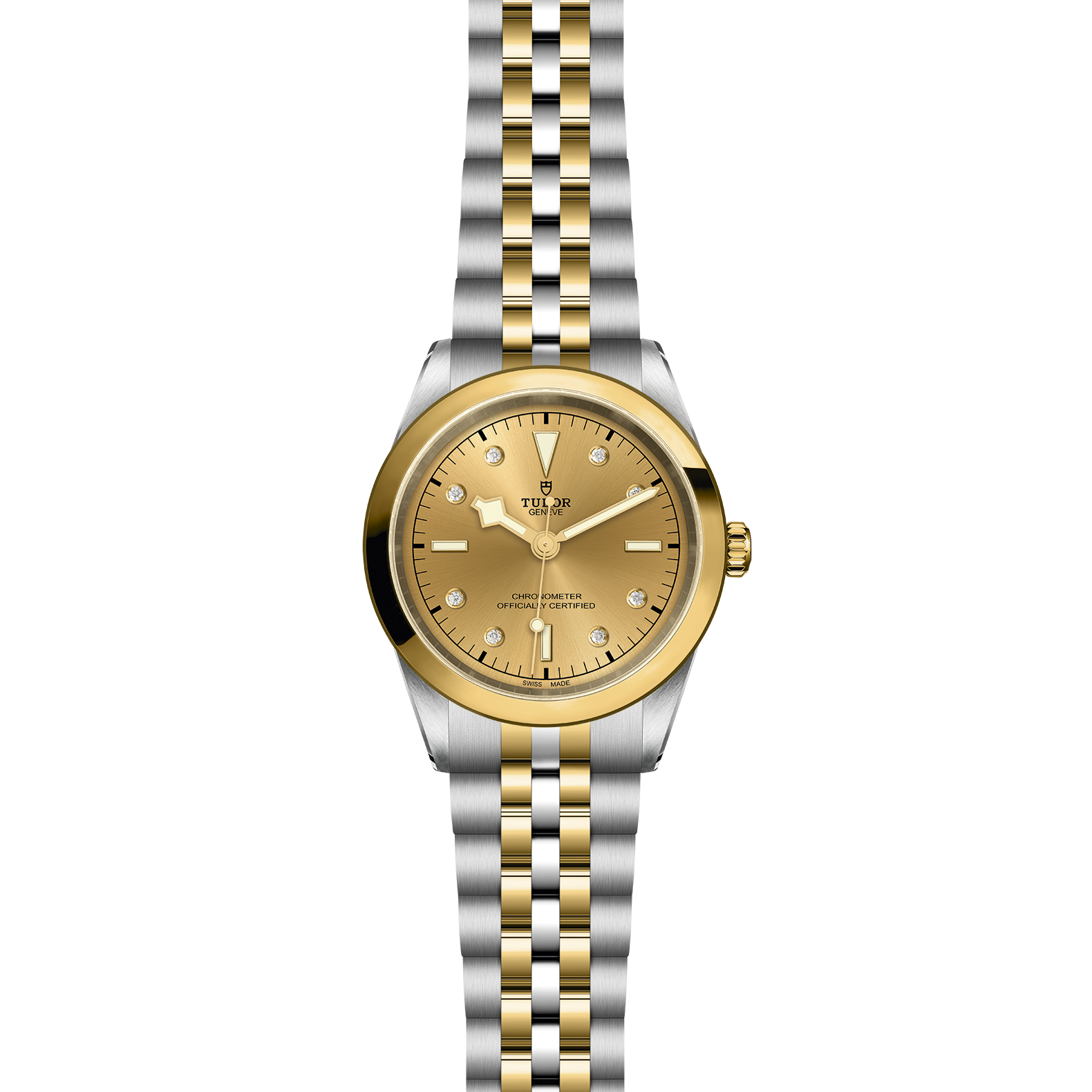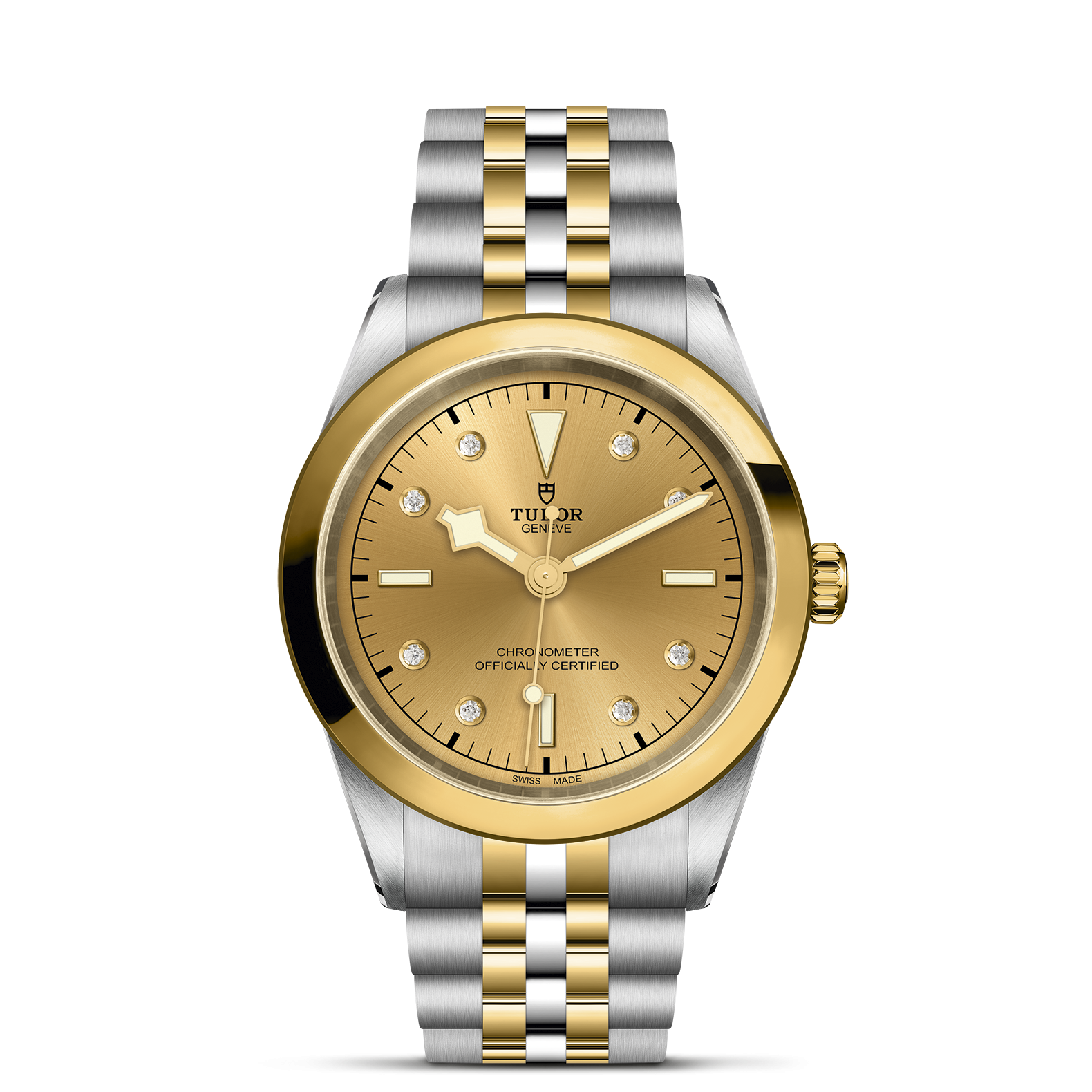 Erste Mittelelemente in Edelstahl oder massivem Gelbgold. Weitere Mittelelemente gefertigt in Edelstahl, überzogen mit 0,2 mm Gelbgold. TUDOR „T-fit“-Sicherheitsfaltschließe. Das Logo auf der Schließe ist aus massivem Gelbgold gefertigt.