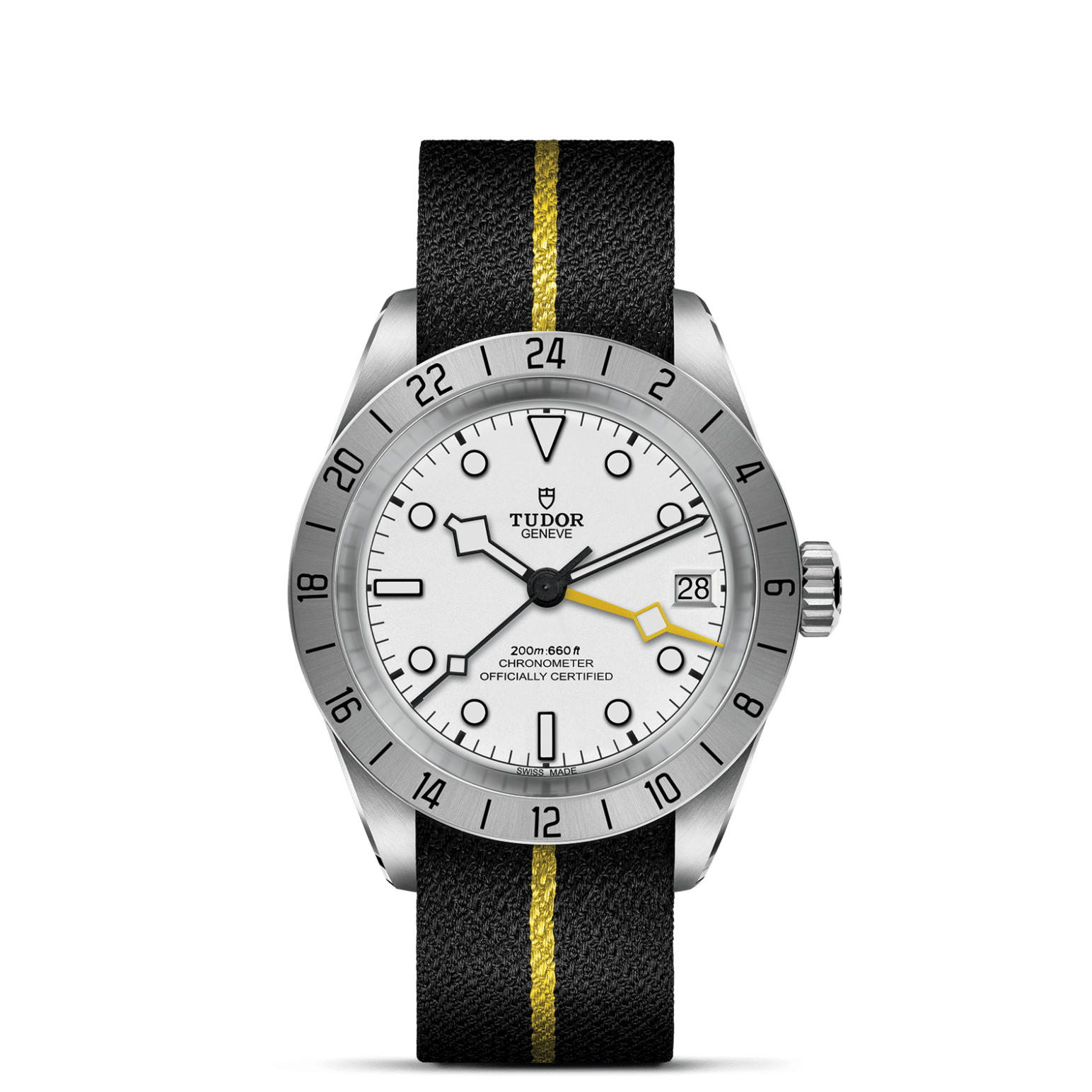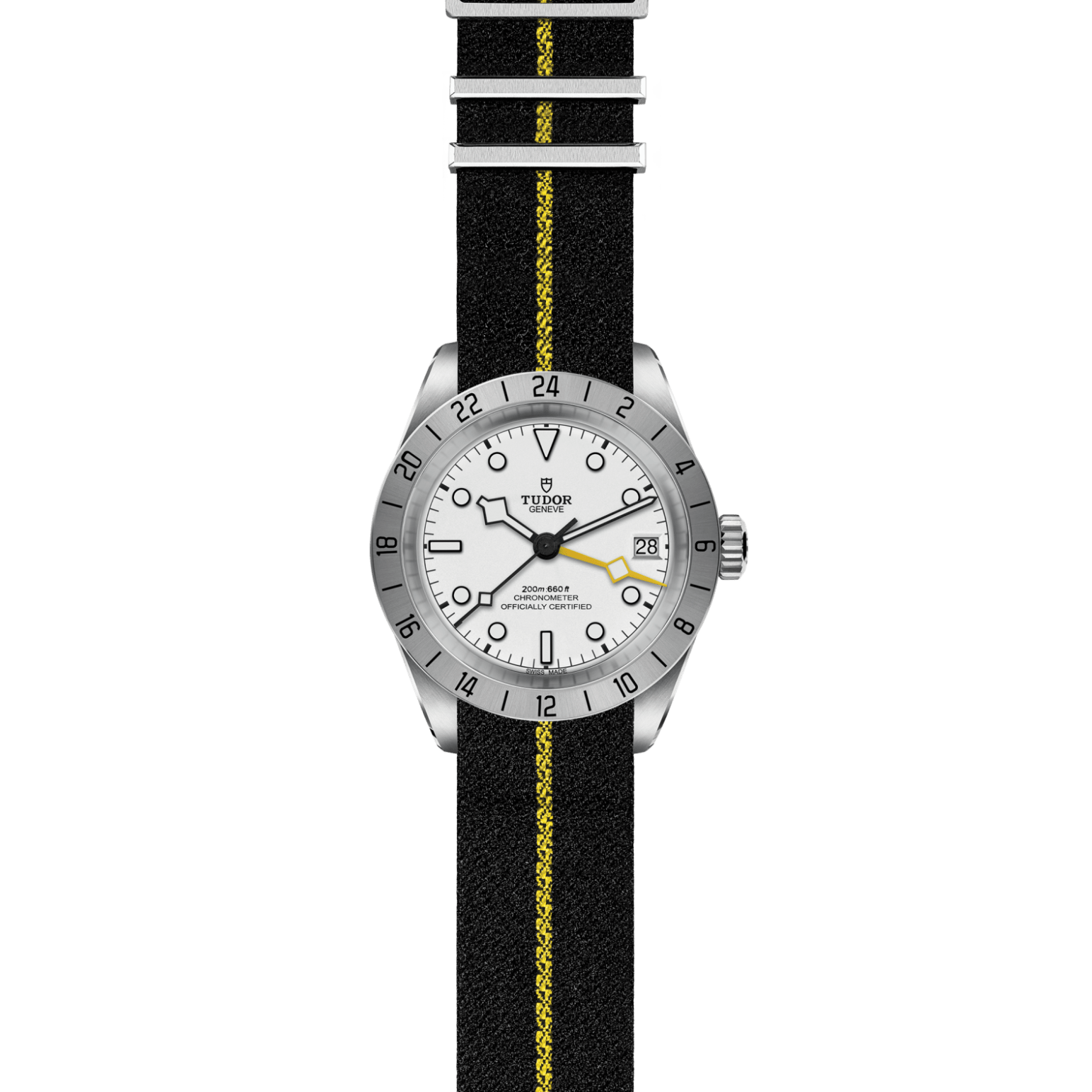 Gehäuse in Edelstahl, 39 mm, Schwarzes Textilband mit gelbem Streifen