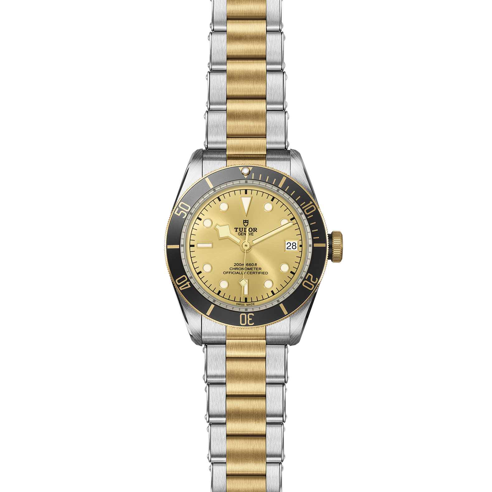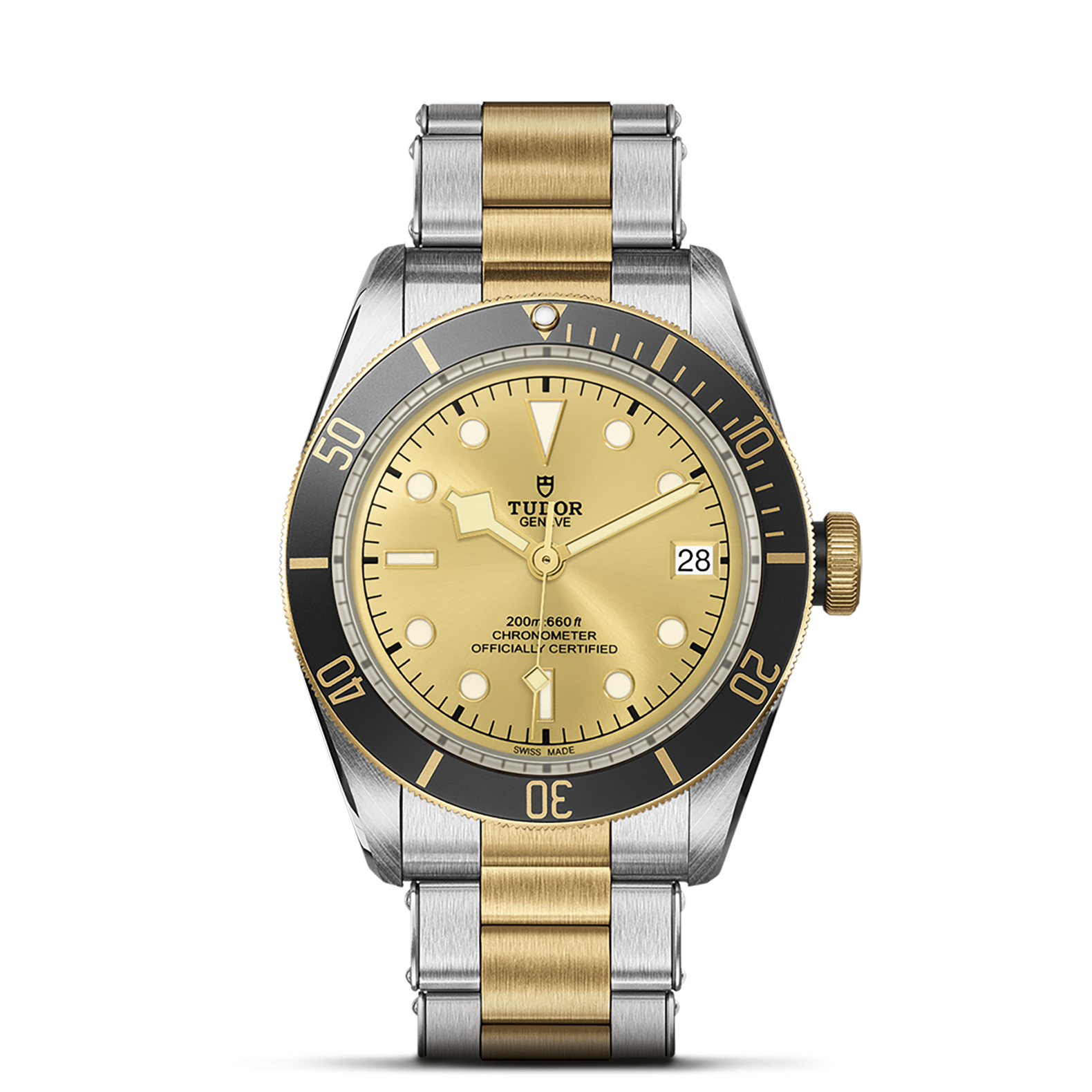 Verschraubbare Aufzugskrone mit gravierter und schwarz lackierter TUDOR Rose und Kronentubus aus schwarz eloxiertem Aluminium. Edelstahl, überzogen mit 0,3 mm Gelbgold