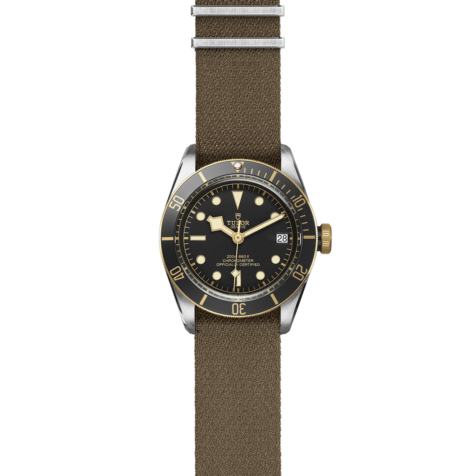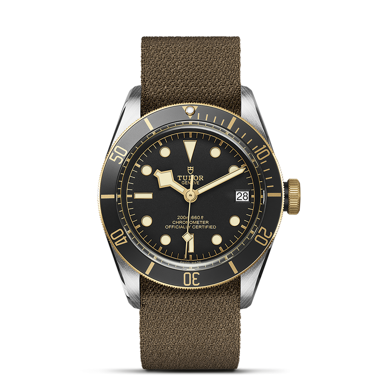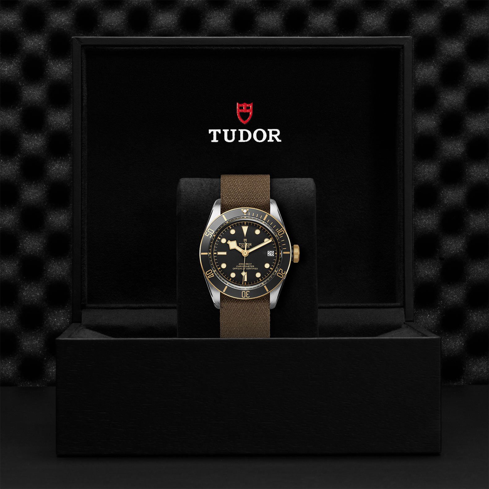 Verschraubbare Aufzugskrone mit gravierter und schwarz lackierter TUDOR Rose und Kronentubus aus schwarz eloxiertem Aluminium. Edelstahl, überzogen mit 0,3 mm Gelbgold