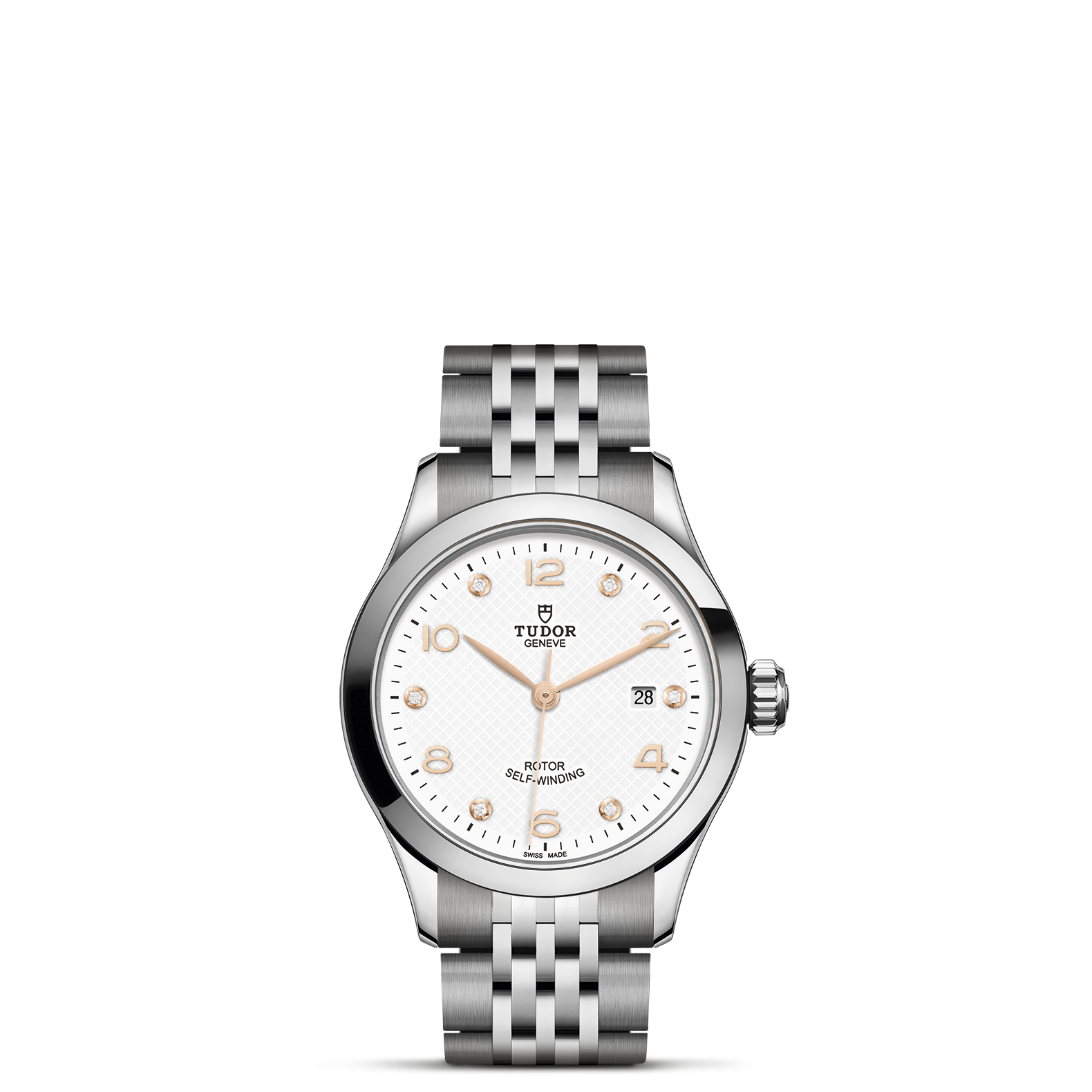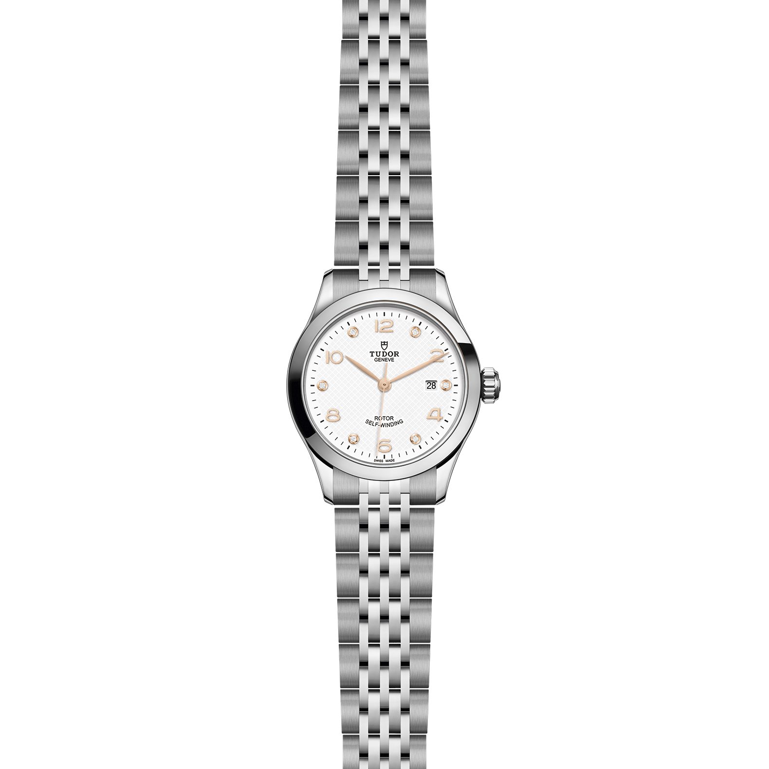 Gehäuse in Edelstahl, 28 mm, Weißes Zifferblatt mit Diamanten