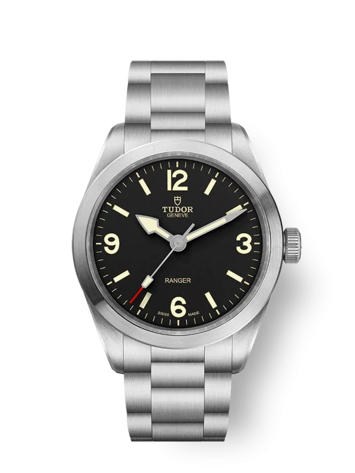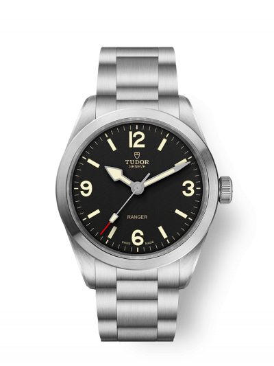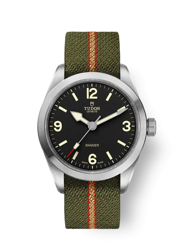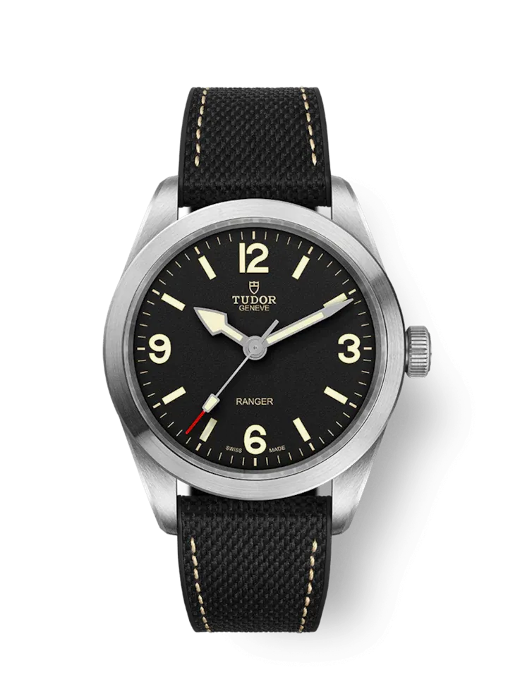 Die Ranger ist außerdem mit einem vollständig satinierten Edelstahlband mit der TUDOR „T‑fit“‑Schließe mit Schnellverstellsystem mit einem Armband aus Naturkautschuk und stoffähnlich strukturiertem schwarzem Leder mit beigefarbenen Nähten und einer Faltschließe verfügbar.
