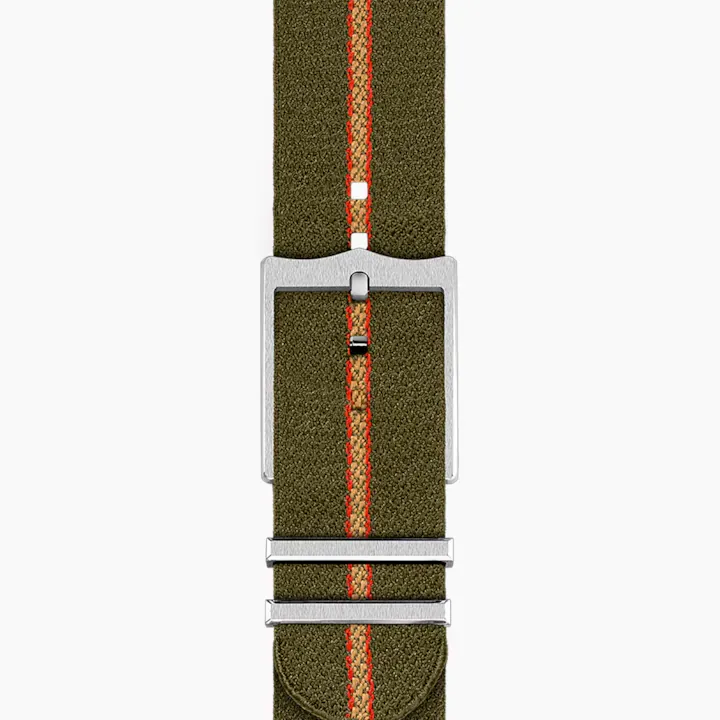 Für das Modell Ranger wählte TUDOR ein olivgrünes Armband mit zwei roten und einem beigefarbenen Streifen, das von den Kunsthandwerkern gefertigt wurde.