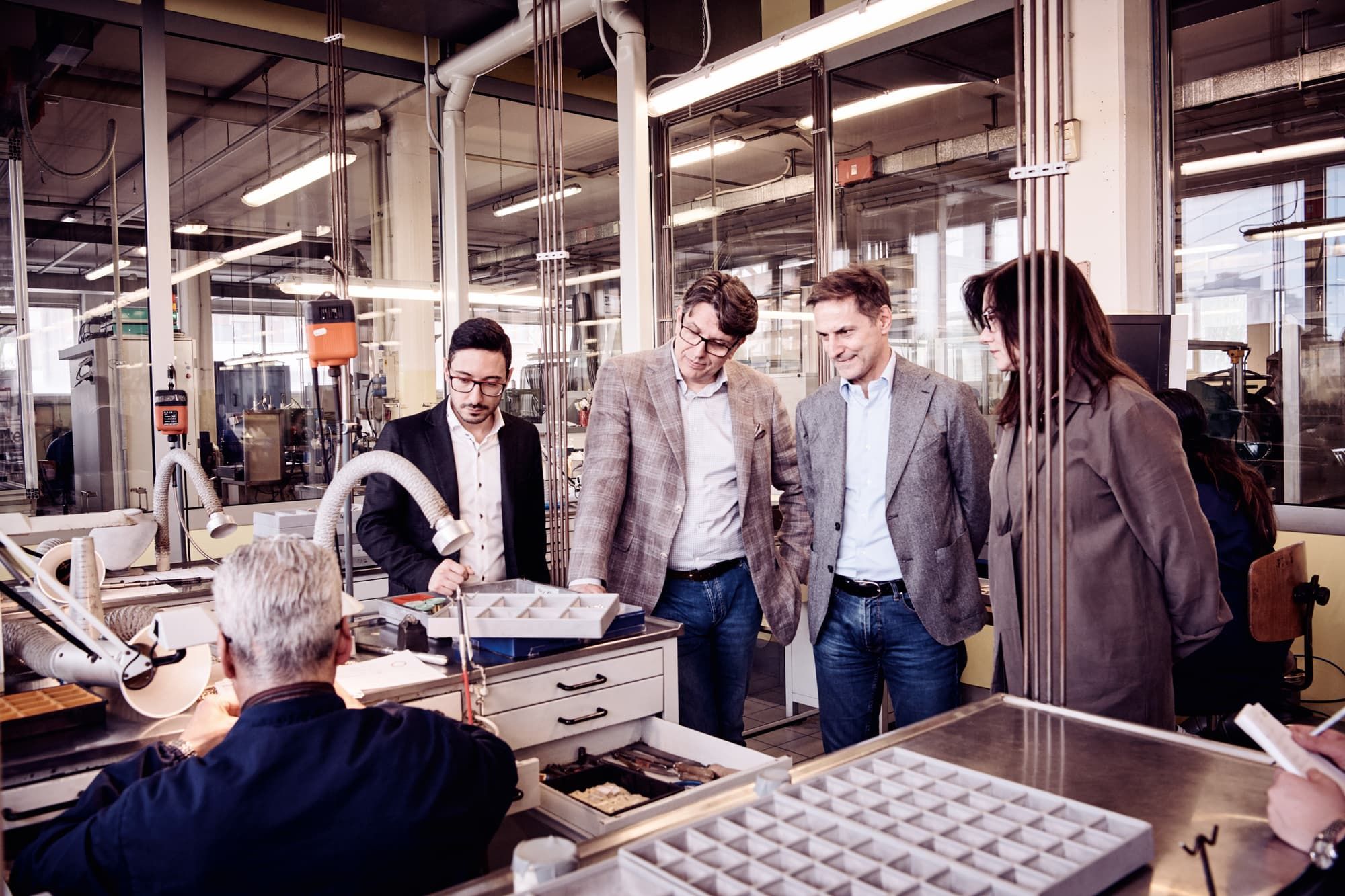 Auf dem Weg nach unten in die Manufaktur erfahren wir, dass jedes Fope-Schmuckstück erst auf Bestellung der Juweliere inhouse produziert wird. Um die bestmögliche Qualität zu erzielen, kombiniert Fope dabei die Handwerkskunst der Goldschmiede mit innovativen Fertigungsmethoden.