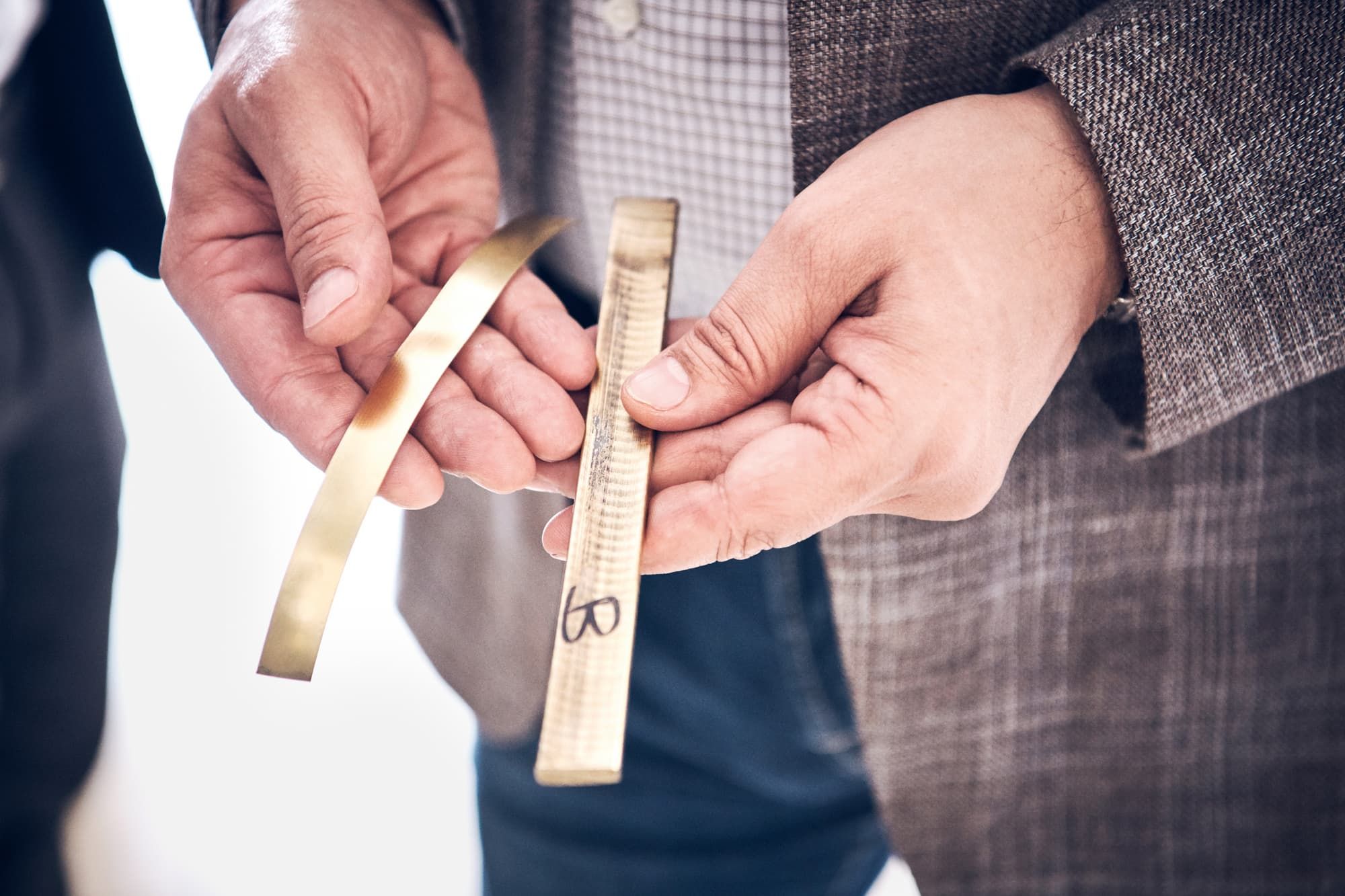 „Jede einzelne Komponente, selbst die winzigen Federn, besteht aus 18-karätigem Gold“, erklärt Giuseppe Marcheluzzo. „Flex’it kommt komplett ohne Schweißnähte aus: Die einzelnen Teile werden ausschließlich mechanisch zusammengesetzt.“ Diese patentierte Technik sorgt dafür, dass die Armbänder und Ringe schön flexibel sind und sich ohne Verschluss einfach über das Handgelenk bzw. den Finger rollen lassen. An der ersten Station unserer Führung werden wir dank eines Mitarbeiters zum ersten Mal ins Staunen versetzt. Greift er doch einfach hinter sich, zaubert ein zusammengelegtes meterlanges Goldband hervor und legt es uns in die Hände: die Basis der Flex’it-Kollektion, aus purem 18-karätigen Gold gefertigt und trotzdem unerwartet schwer.